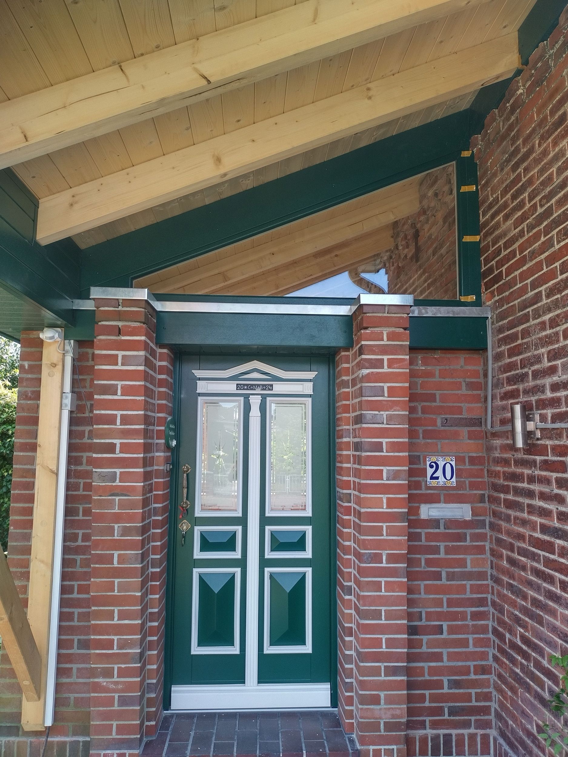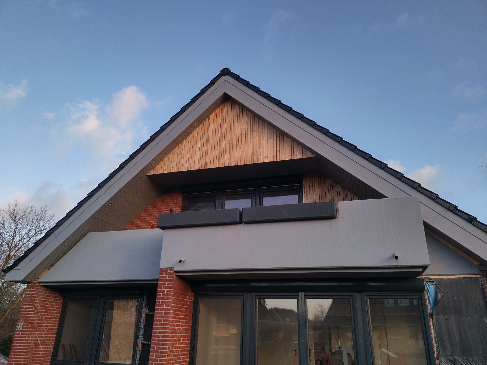Hier haben wir ein vorhandenes sanierungsbedürftiges Flachdach entfernt und ein neues Dach mit Gefälle errichtet. Verwendet haben wir rote Faserzementplatten mit einem Lichtband für einen hellen Innenbereich.